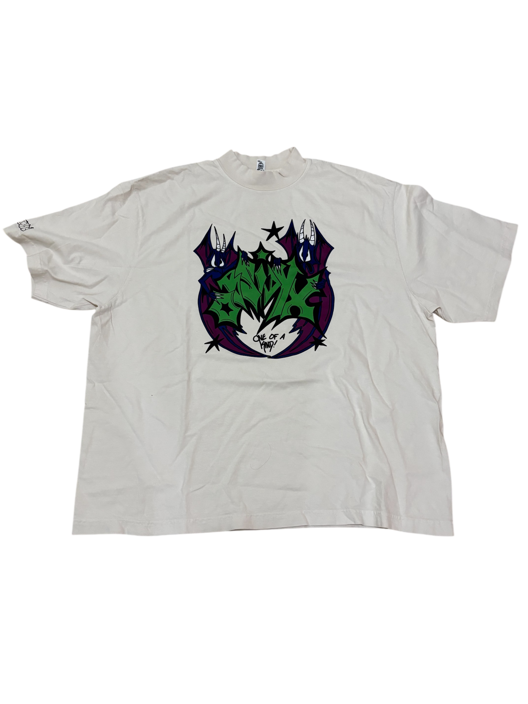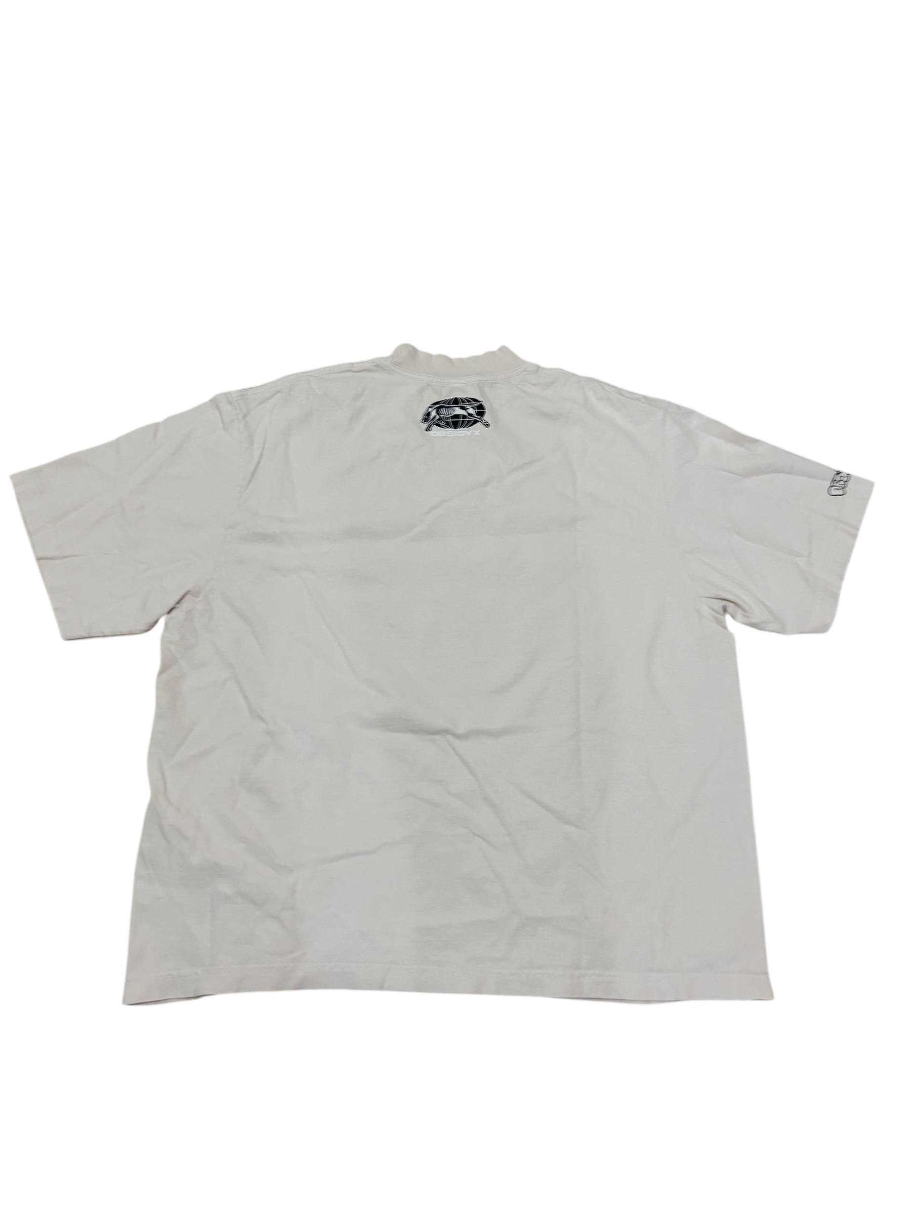 6.5 oz oversized mock neck heavy weight cream colored tee shirt. Featuring our alternate color way heart sigil print at the center front at 12”. Our bubble letter logo is printed on the sleeve at 3” and our greyhound logo is printed on the back yoke at 3.5”. This garment is pre shrunk and fits slightly oversized